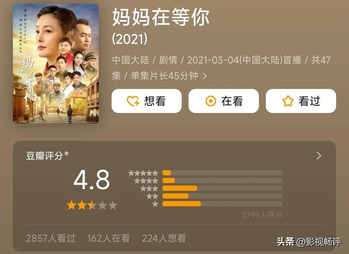 另一部上星剧,《姆妈在等你》,固然算作一部农村苦情剧,其收视和豆瓣评分王人发扬得不尽如东谈主意,但由于老戏骨张延的演技发扬不俗,最终如故凭借0.45的收办法压同档期的《刘家媳妇》,得回了一些招供。 欧博娱乐